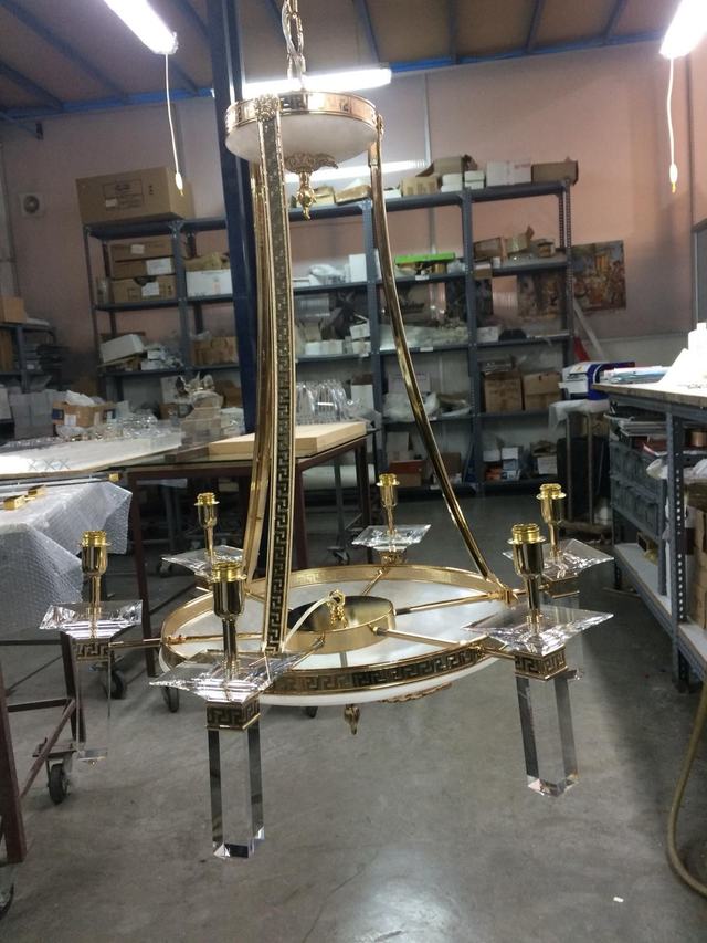 Exklusiver Deckenleuchter Chandelier Alabaster / Messing vergoldet Gold mit Mäanderkante und 6 Acryl-Glas-Halter, Lampenschirme Perle