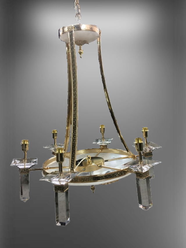 Deckenleuchter Acrylglas, Alabaster und Messing vergoldet mit Mäanderkante 6flammig