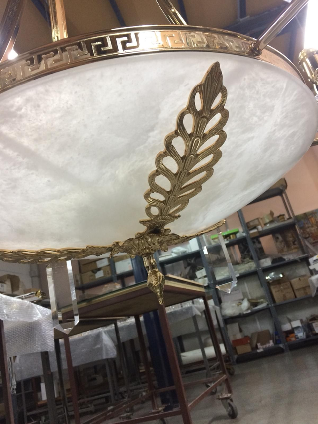 Exklusiver Leuchter aus Messing vergoldet, Mäanderdekoration an den drei senkrechten Streben und um die mittige Alabasterschale (transparent naural), 6 Leuchtenhalter aus Acryl-Glas. Lampenschirme weiß / beige